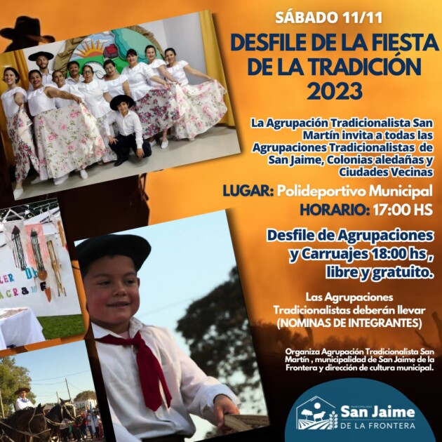 30 octubre, 2023 - En Eventos‚ Gestión‚ Gobierno Por Prensa Municipal Comentarios Apagados 11/11 Desfile día de la Tradición Prensa Municipal prensa@sanjaime.gob.ar Previo Baja Presión de Agua Siguiente 40 Años de Democracia