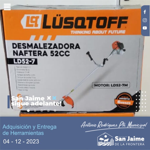 Durante esta mañana el presidente municipal Antonio Rodríguez hizo entrega de 4 moto guadañas para el personal encargado del mantenimiento de espacios verdes de la Municipalidad.