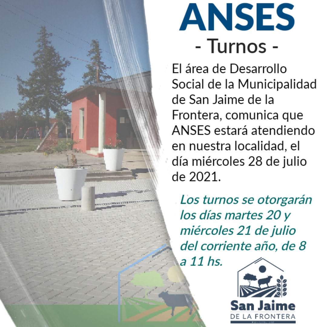 14 julio, 2021 - En Noticias Por Prensa Municipal Comentarios Apagados ANSES ATENDERÁ EL 28 DE JULIO ANSES ATENDERÁ EN SAN JAIME EL DÍA MIÉRCOLES 28 DE JULIO Prensa Municipal prensa@sanjaime.gob.ar Previo DONACIÓN DEL CLUB DE LEONES CHAJARÍ PARA EL HOGAR SAN LUIS Siguiente COORDINACIÓN DE TRABAJOS EN LA OBRA DE RED DE AGUA Y CLOACA