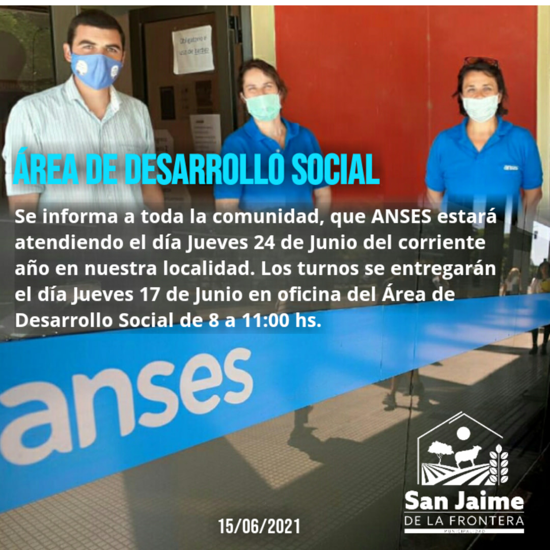 15 junio, 2021 - En Noticias Por Prensa Municipal Comentarios Apagados ANSES ATENDERÁ EN SAN JAIME Prensa Municipal prensa@sanjaime.gob.ar Previo PAGO AGUINALDO Siguiente ÁREA DEPORTE