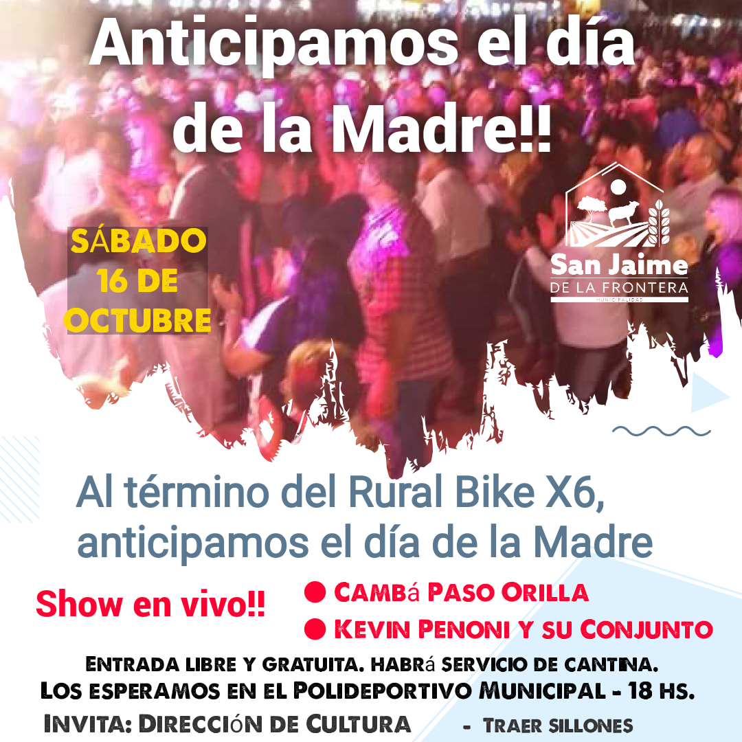 15 octubre, 2021 - En Noticias Por Prensa Municipal Comentarios Apagados ANTICIPAMOS DÍA DE LA MADRE Prensa Municipal prensa@sanjaime.gob.ar Previo 3° FECHA DEL RURAL BIKE X 6, EN SAN JAIME DE LA FRONTERA Siguiente NUEVA SESIÓN DEL H.C.D. SAN JAIME
