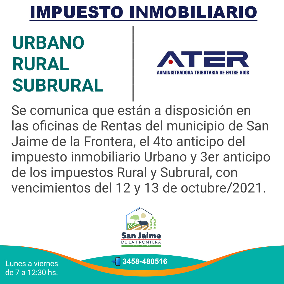 3 octubre, 2021 - En Noticias Por Prensa Municipal Comentarios Apagados AVISO DE VENCIMIENTOS Prensa Municipal prensa@sanjaime.gob.ar Previo ESTE DOMINGO 3 DE OCTUBRE EXPO FERIA Siguiente AVANCES DEL PROYECTO DE RENOVACIÓN URBANA