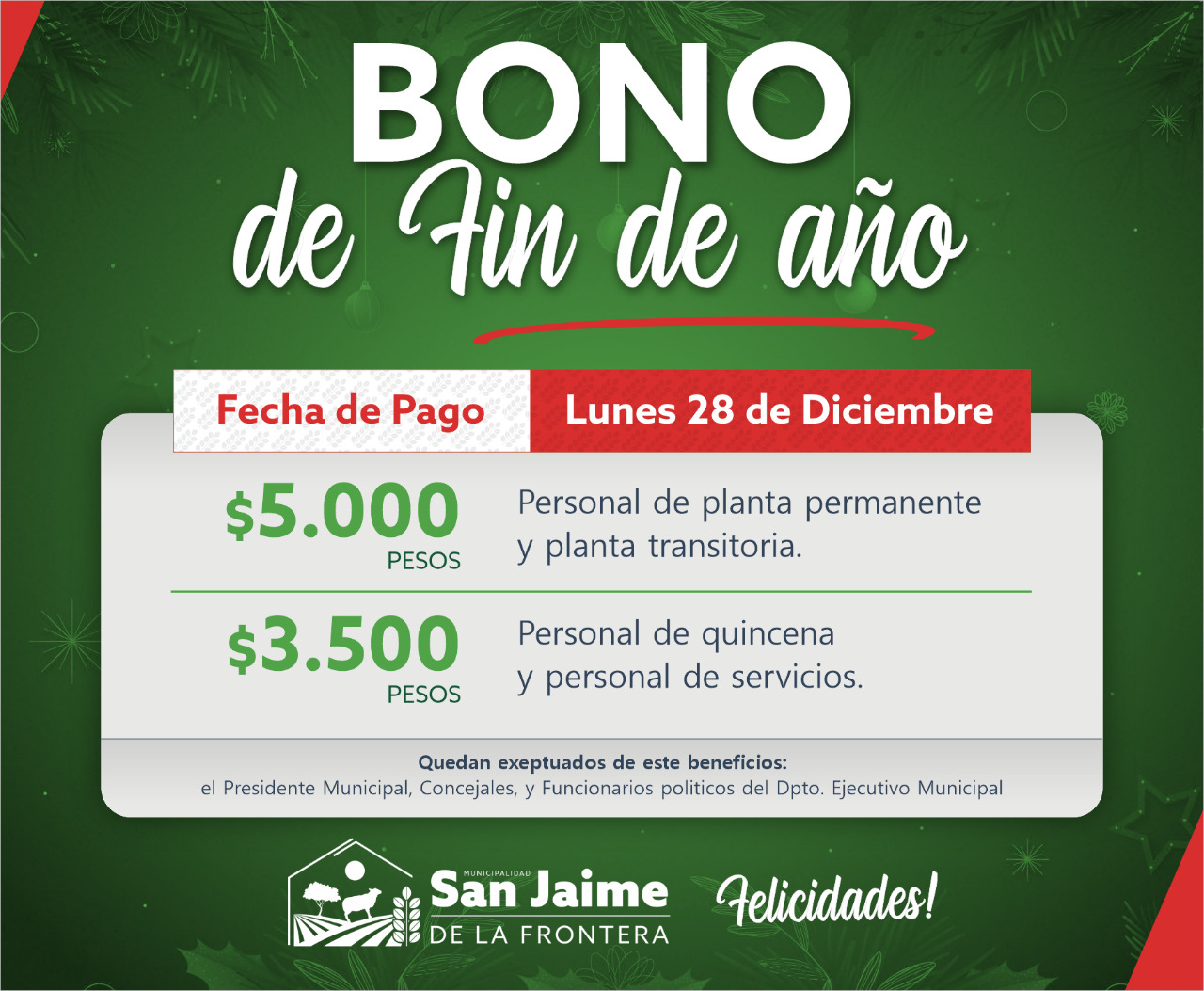 22 diciembre, 2020 - En Noticias Por Prensa Municipal Comentarios Apagados BONO DE FIN DE AÑO Prensa Municipal prensa@sanjaime.gob.ar Previo GANADORES CONCURSO FOTOGRÁFICO “MIRADAS DE LA PANDEMIA” Siguiente FELICES FIESTAS PERSONAL MUNICIPA