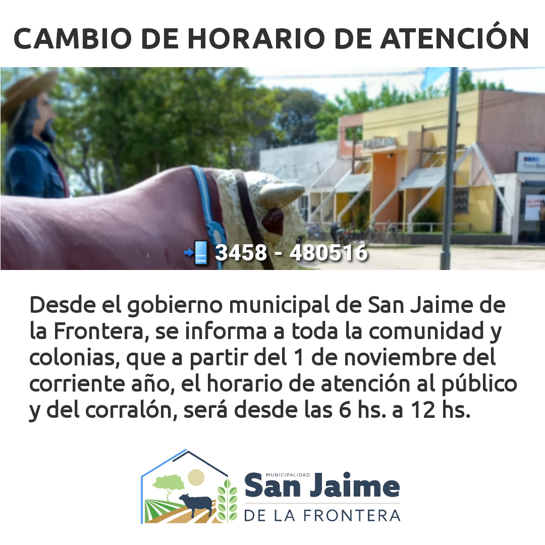 1 noviembre, 2021 - En Noticias Por Prensa Municipal Comentarios Apagados CAMBIO HORARIO DE ATENCIÓN Prensa Municipal prensa@sanjaime.gob.ar Previo 4° FECHA CROSS AVENTURA X6 Siguiente SANJAIMENSES EN EL MULTITUDINARIO CRUCE DE SALTO GRANDE