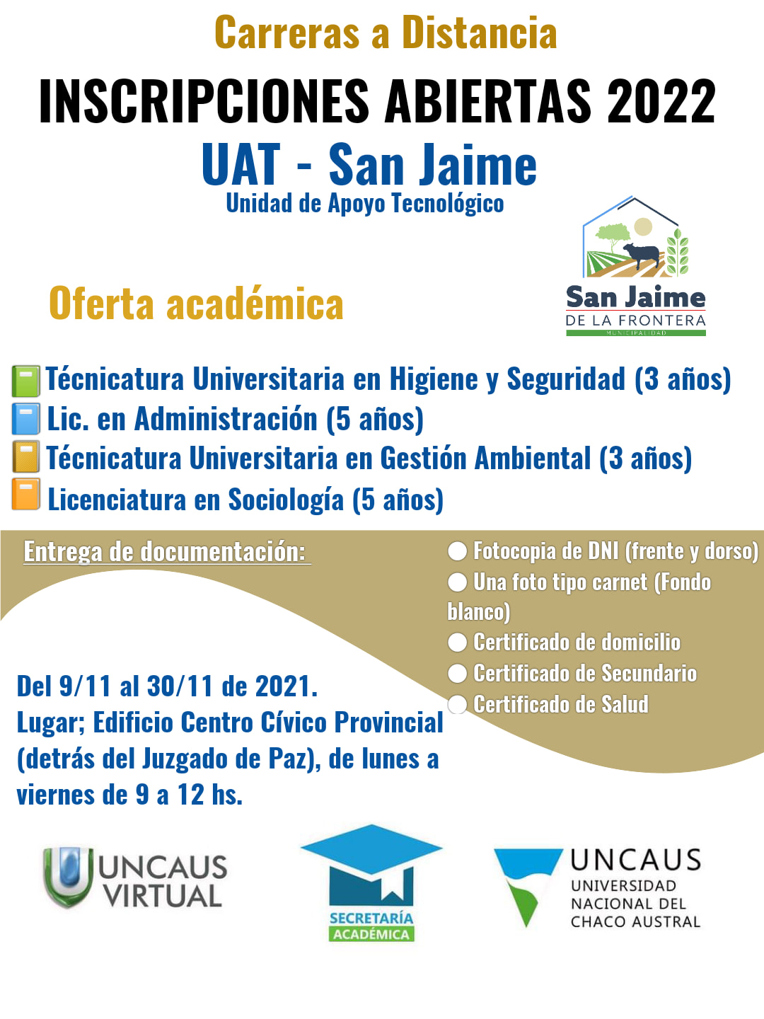 5 noviembre, 2021 - En Noticias Por Prensa Municipal Comentarios Apagados CARRERAS UNIVERSITARIAS A DISTANCIA UAT-SAN JAIME Prensa Municipal prensa@sanjaime.gob.ar Previo ESTE DOMINGO 7 DE NOVIEMBRE “ESTAMOS DE FERIA” Siguiente NUEVO SORTEO DE CASCOS – 5/11/2021
