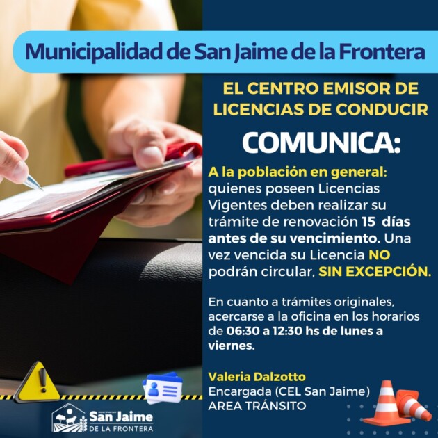 24 mayo, 2023 - En Eventos‚ Gestión‚ Gobierno‚ Tránsito e Inspección Por Prensa Municipal Comentarios Apagados Centro Emisor de Licencias de Conducir Prensa Municipal prensa@sanjaime.gob.ar Previo Convocatoria Desarrollo Social Siguiente Tareas en vísperas del 25 de Mayo