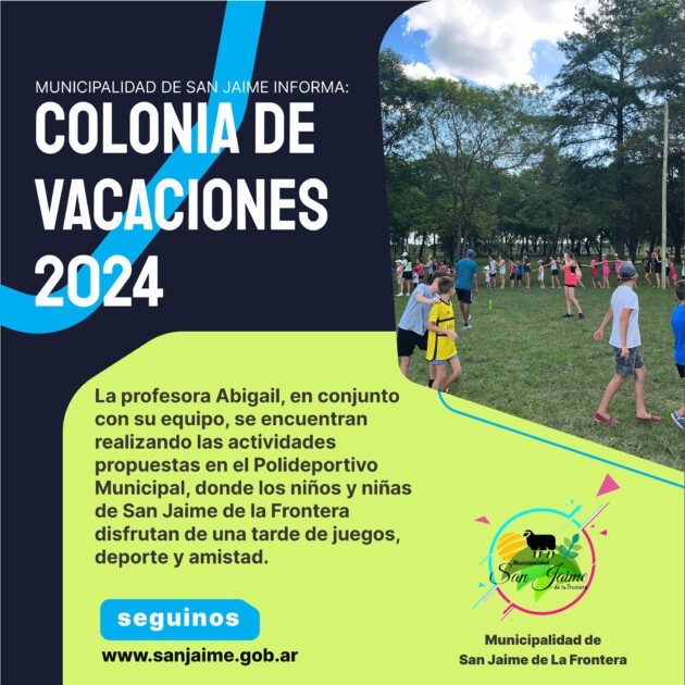 24 enero, 2024 - En Destacadas‚ Gestión Por Prensa Municipal Comentarios Apagados Colonia de Vacaciones 2024 Prensa Municipal prensa@sanjaime.gob.ar Previo Visita del Segundo Jefe de Puesto Caminera de San Jaime, el Sr Martínez Cristian Sebastián. Siguiente Receso Administrativo y De Servicios Públicos