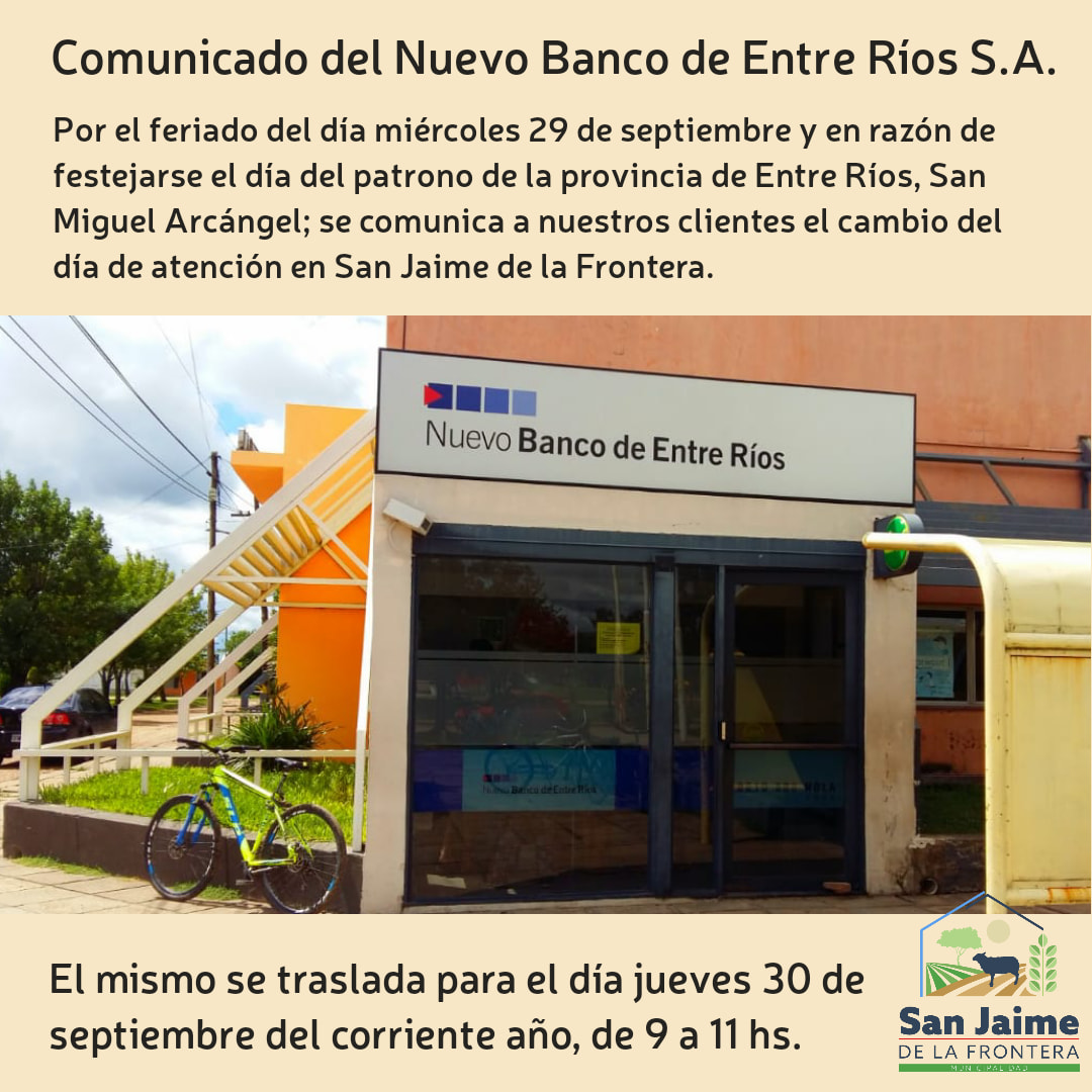 28 septiembre, 2021 - En Noticias Por Prensa Municipal Comentarios Apagados COMUNICADO NUEVO BANCO ENTRE RIOS Prensa Municipal prensa@sanjaime.gob.ar Previo ENTREGA DE SEMILLAS TEMPORADA PRIMAVERA/VERANO 2021 Siguiente SAN MARTÍN RUGBY CLASIFICÓ 1RO PARA LA COPA DE ORO