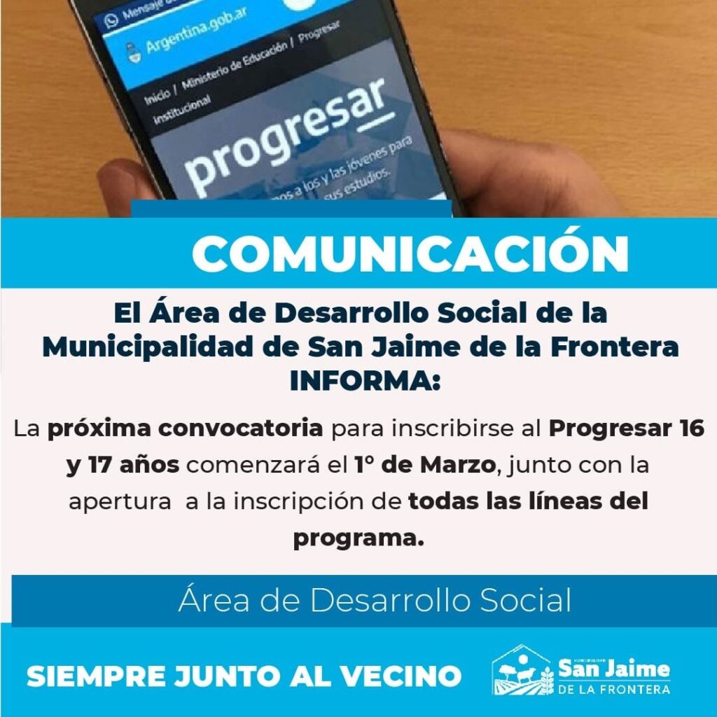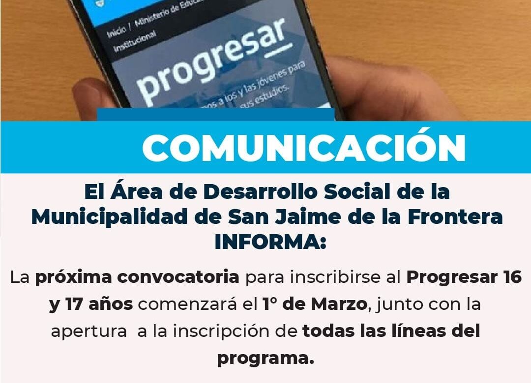 10 febrero, 2022 - En Gestión‚ Gobierno Por Prensa Municipal Comentarios Apagados Convocatoria Programa “PROGRESAR” Prensa Municipal prensa@sanjaime.gob.ar Previo Impuesto Inmobiliario Urbano Siguiente Becas PROGRESAR
