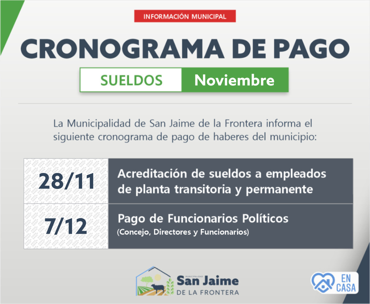 24 noviembre, 2020 - En Noticias Por Prensa Municipal Comentarios Apagados CRONOGRAMA DE PAGO Prensa Municipal prensa@sanjaime.gob.ar Previo LIMPIEZA EN ENTRADA A LA LOCALIDAD POR RUTA PROV. Nro 1 Siguiente CONTINÚAN LOS TRABAJOS DE LIMPIEZA Y ELIMINACIÓN DEL BASURAL A CIELO ABIERTO