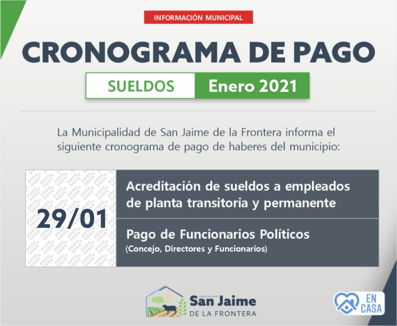 26 enero, 2021 - En Noticias Por Prensa Municipal Comentarios Apagados CRONOGRAMA DE PAGO Prensa Municipal prensa@sanjaime.gob.ar Previo PROGRAMA MENOS BOLSAS PLÁSTICAS, MEJOR AMBIENTE Siguiente LICITACIÓN PRIVADA CONCESIÓN CANTINA-COMEDOR TERMINAL DE ÓMNIBUS