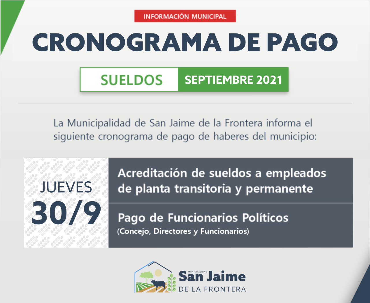 28 septiembre, 2021 - En Noticias Por Prensa Municipal Comentarios Apagados CRONOGRAMA DE PAGO Prensa Municipal prensa@sanjaime.gob.ar Previo NUEVO AUMENTO SALARIAL Siguiente LLEGARON 25.736 NUEVOS ADOQUINES PARA DOS PROYECTOS DE OBRAS