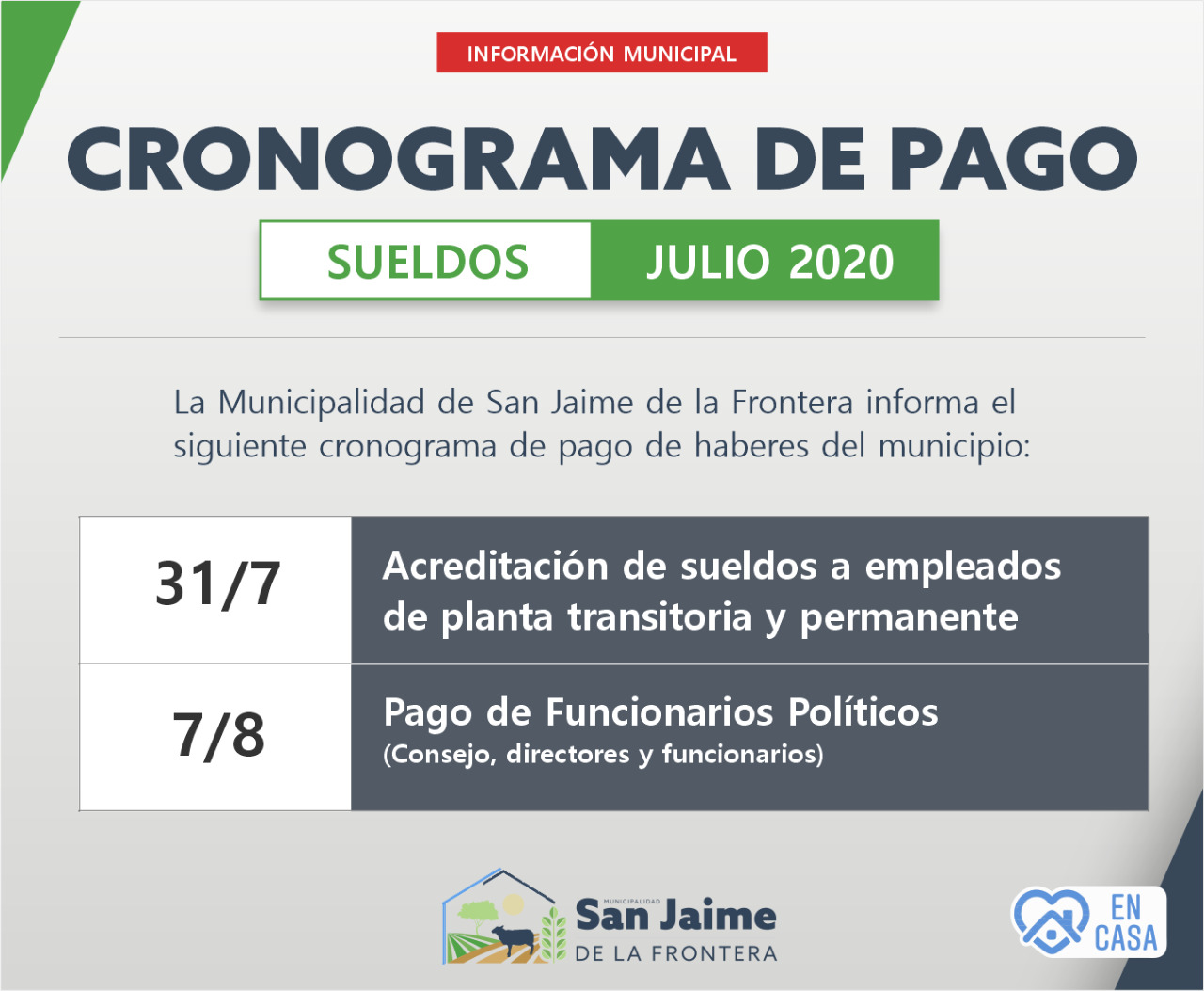 30 julio, 2020 - En Noticias Por Prensa Municipal Comentarios Apagados CRONOGRAMA PAGOS Prensa Municipal prensa@sanjaime.gob.ar Previo HONORABLE CONCEJO DELIBERANTE Siguiente ESPACIOS VERDES