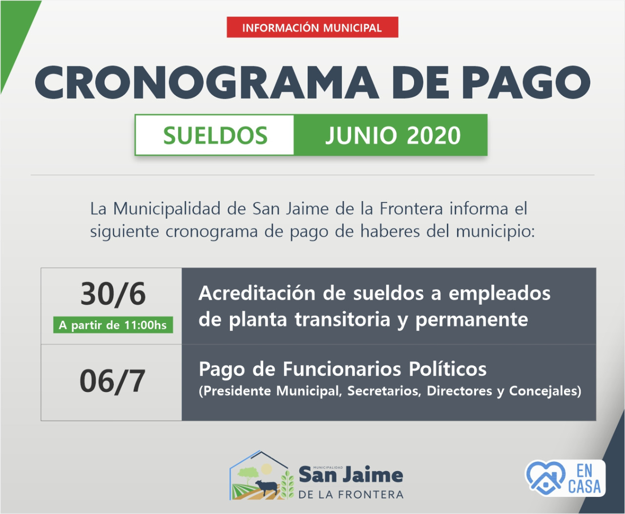 26 junio, 2020 - En Noticias Por Prensa Municipal Comentarios Apagados CRONOGRAMAS DE PAGOS Prensa Municipal prensa@sanjaime.gob.ar Previo ANSES | ENTREGA GRATUITA DE TABLET Siguiente NUEVA SESIÓN HCD
