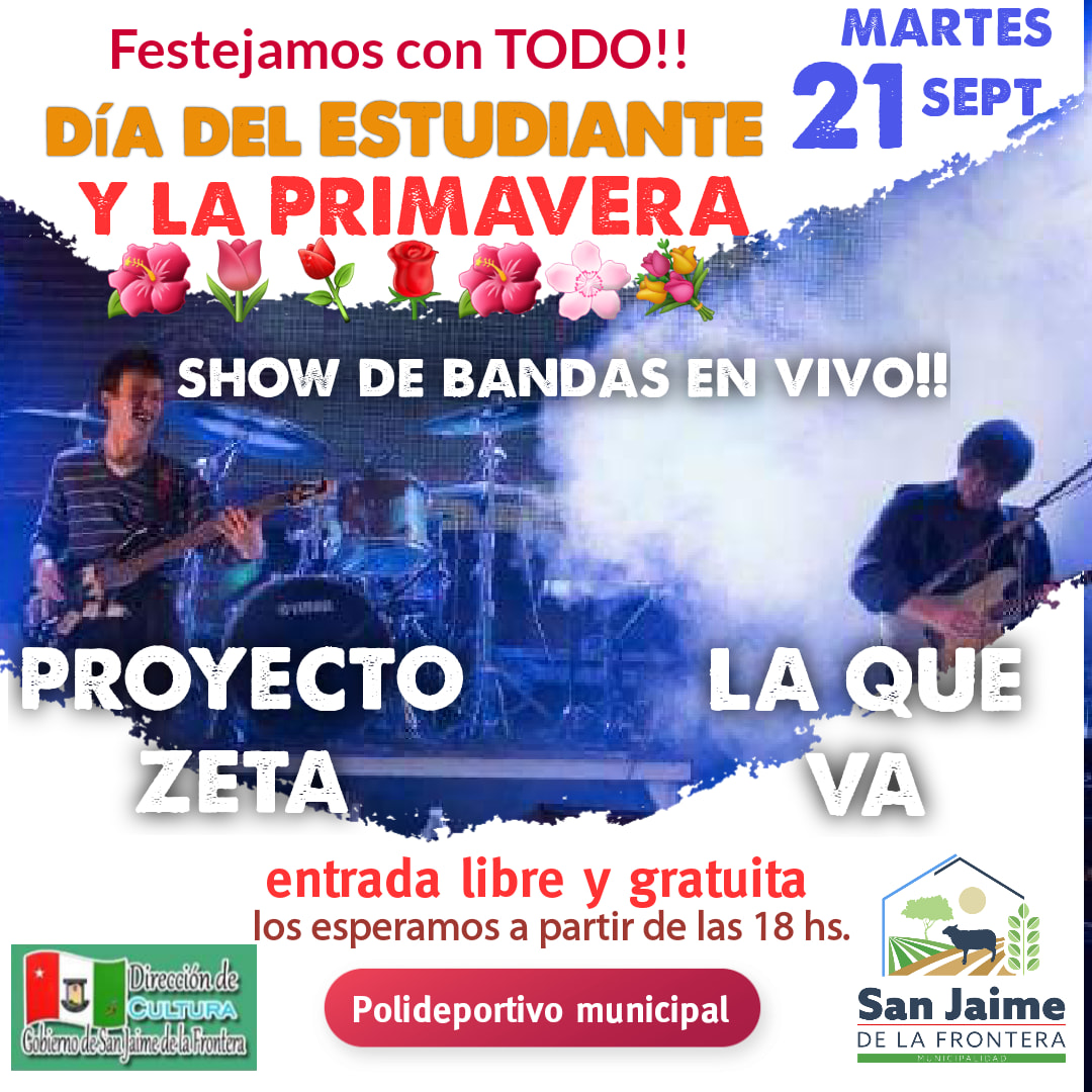 ✅Dirección de Cultura, Invita a todos los Estudiantes al Show de Bandas “PROYECTO ZETA – LA QUE VA” , el Martes 21 de Septiembre en el Polideportivo Municipal a partir de las 18:00 Hs.