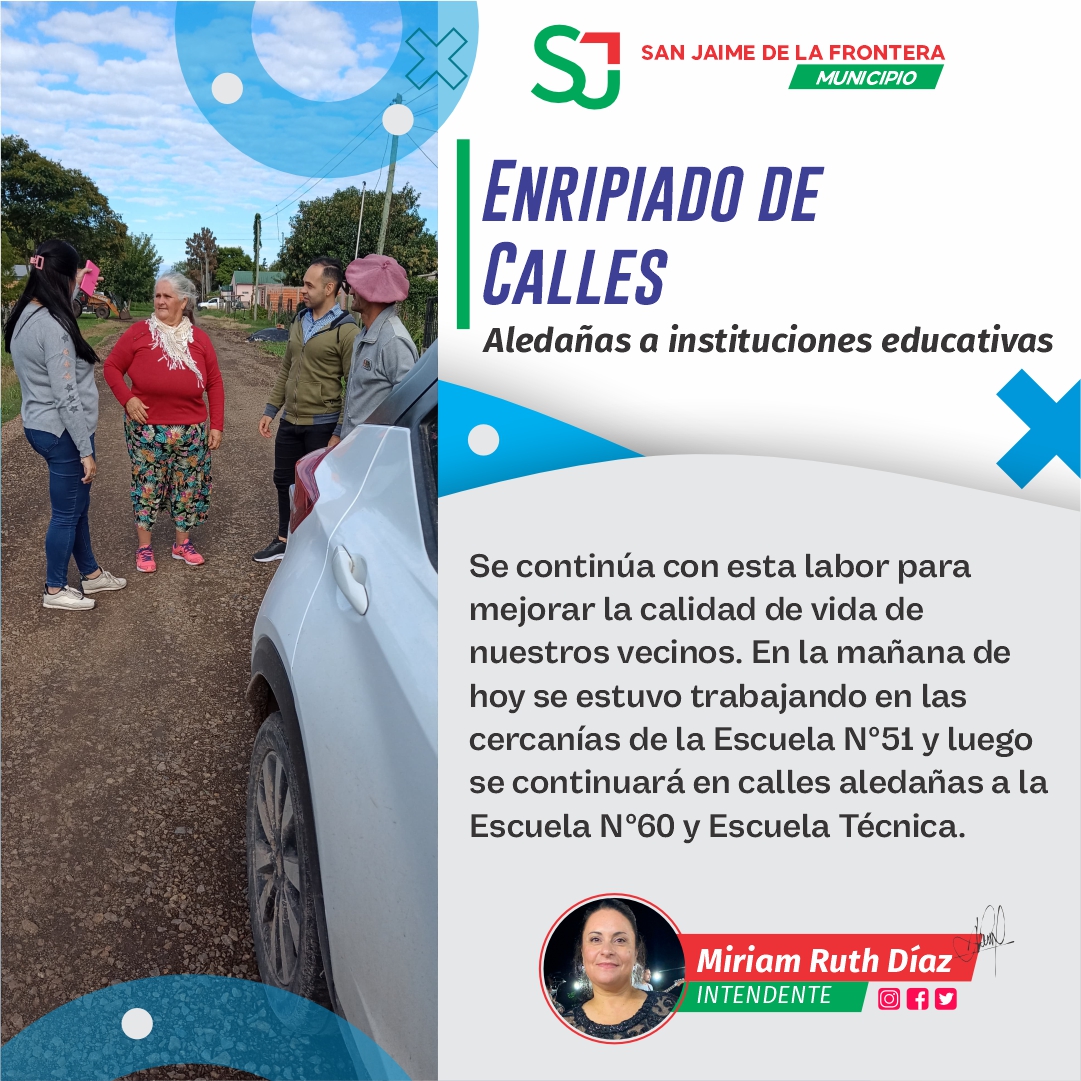 Continuamos enripiando calles aledañas a las instituciones educativas, en la mañana se estuvo trabajando en las cercanías la Esc. N° 51 y luego se continuará en calles aledañas a la Esc. N° 60 y Esc. Técnica. Es nuestro compromiso tomar medidas con la trama vial de la localidad, llevará tiempo mejorarlas, sin embargo llegaremos con el tiempo a cubrir las distintas solicitudes que venimos recibiendo.