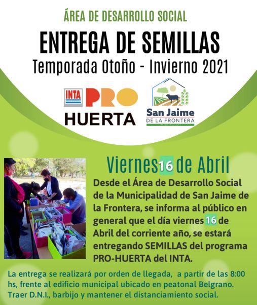 La entrega de semillas del programa PRO-HUERTA del INTA, que estaba programado para el viernes 09, y que fuera suspendido; se llevará a cabo éste viernes 16 de Abril.