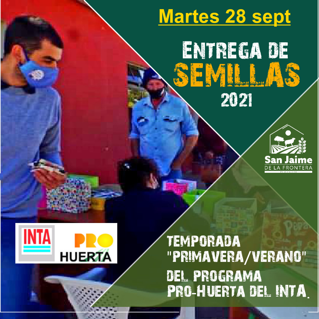 Desde el área de Desarrollo Social de la municipalidad de San Jaime de la Frontera, se comunica que el día martes 28 de septiembre del corriente año, se estará entregando SEMILLAS del programa Pro-Huerta del INTA. Las mismas se entregarán frente al edificio de dicha área por orden de llegada de 8 a 11 hs.