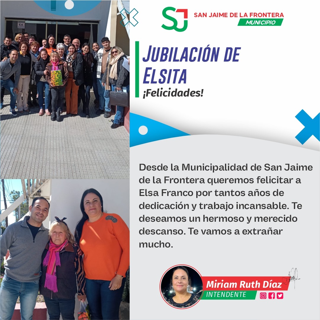13 agosto, 2024 - En Destacadas‚ Gestión‚ Noticias Por Prensa Municipal Comentarios Apagados FELIZ JUBILACIÓN ELSA FRANCO Prensa Municipal prensa@sanjaime.gob.ar Previo TALA Y RETIRO DE ÀRBOLES Siguiente FESTEJOS DÍA DE LA NIÑEZ