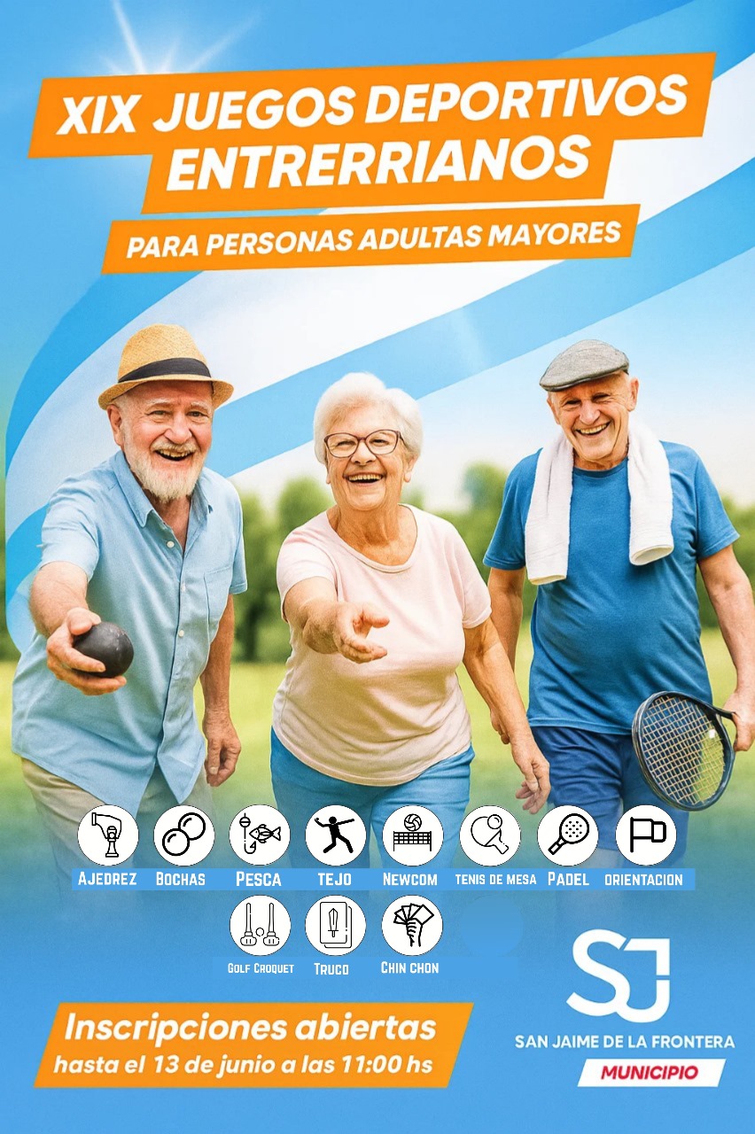Desde la Dirección de Deportes del Municipio de San Jaime de la Frontera informamos que se encuentran habilitadas las inscripciones para los XIXº Juegos Deportivos Entrerrianos para Personas Adultas Mayores.