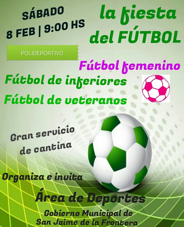 El Área de Deportes de la Municipalidad de San Jaime de la Frontera, organiza e invita a toda la comunidad sanjaimense y colonias a participar y acompañar en lo que será una gran fiesta del fútbol local y regional en sus distintas categorías. Dicho evento se llevará a cabo este sábado 8 de febrero a partir de las 9:00 hs, en el polideportivo municipal.
