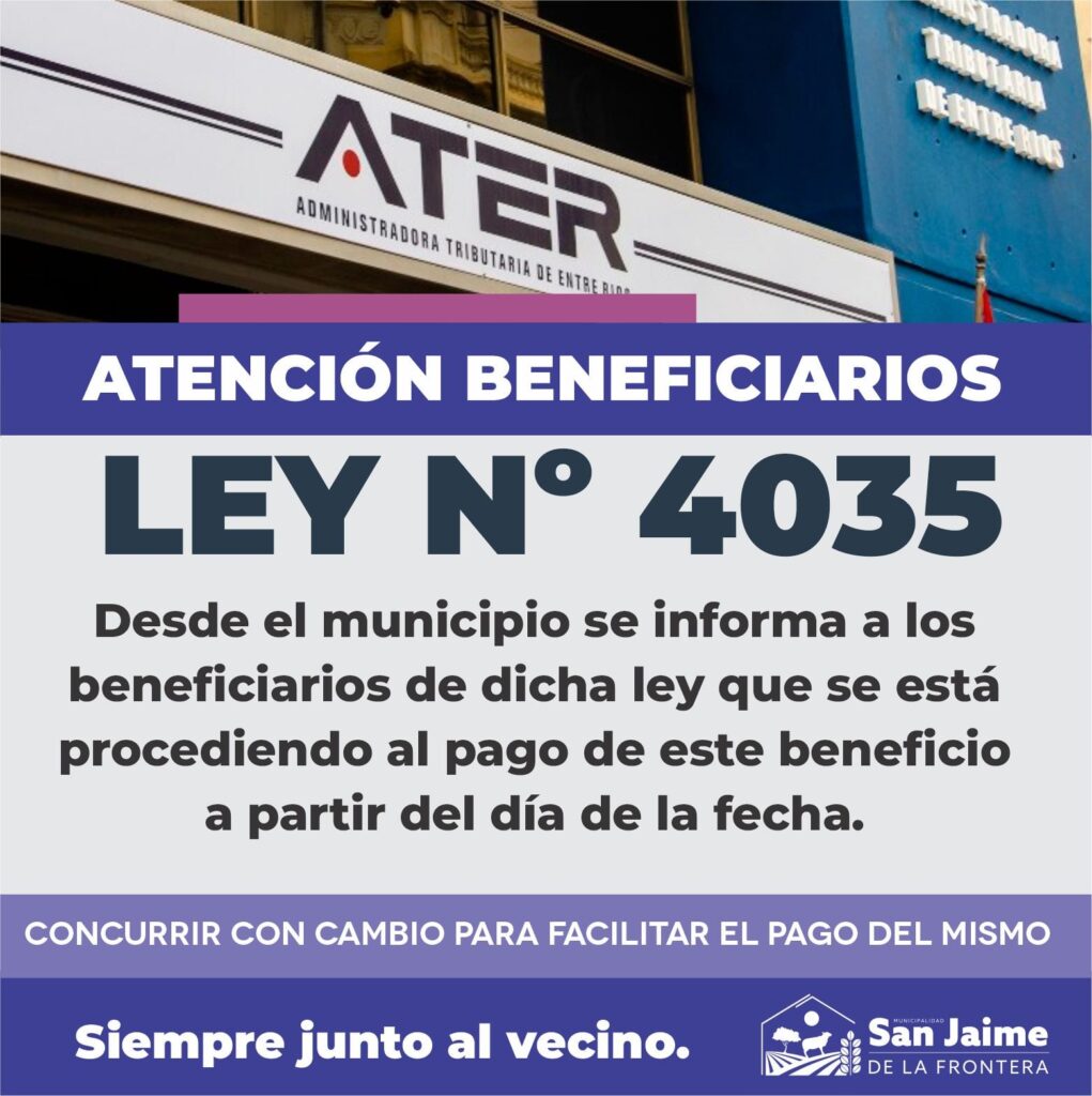 2 febrero, 2022 - En Gestión‚ Gobierno‚ Salud y Bienestar Por Prensa Municipal Comentarios Apagados Ley N° 4035 Prensa Municipal prensa@sanjaime.gob.ar Previo Horarios Atención ANSES Siguiente Trabajos de Urbanización y Saneamiento