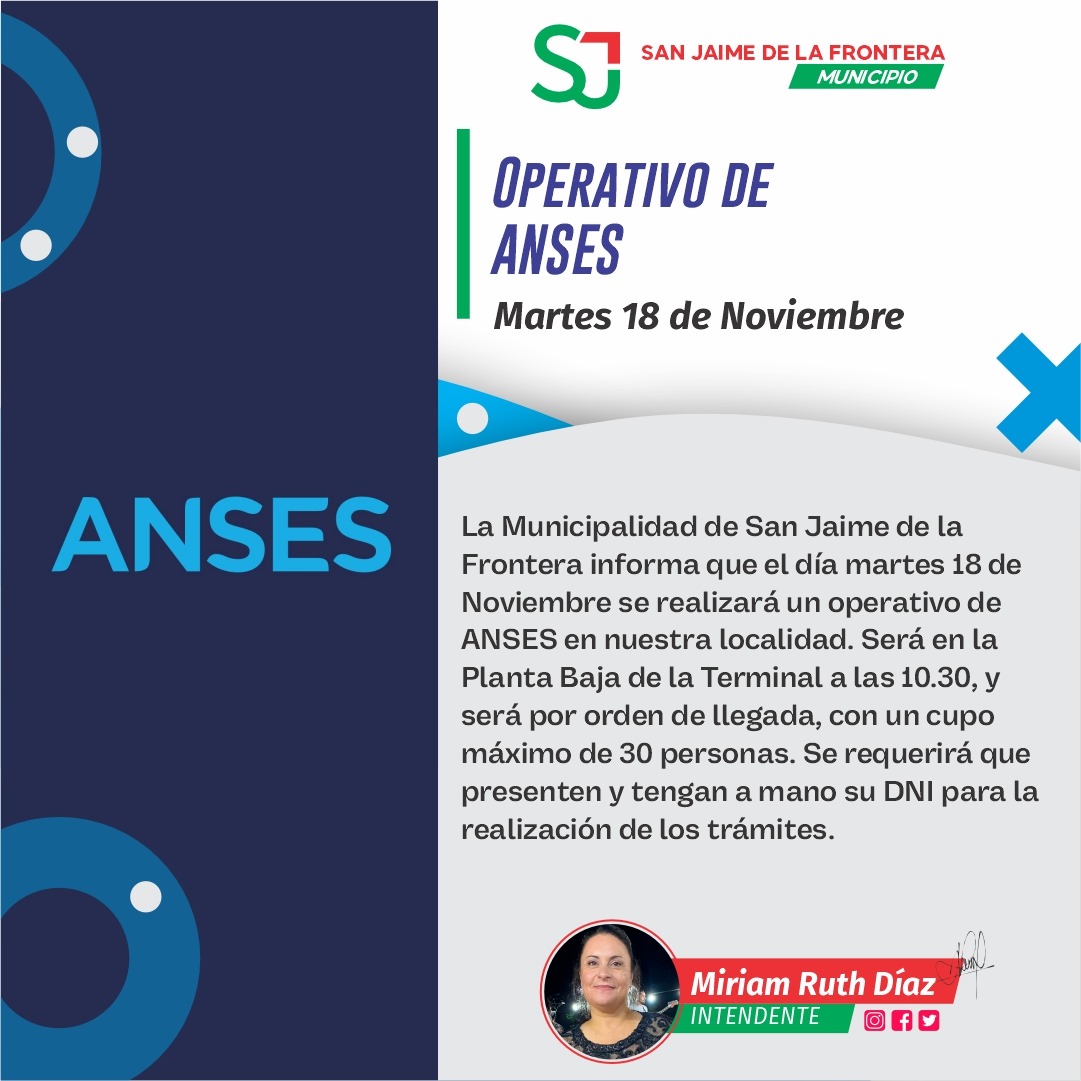 4 noviembre, 2025 - En Destacadas‚ Gestión‚ Noticias Por Prensa Municipal Comentarios Apagados OPERATIVO ANSES Prensa Municipal prensa@sanjaime.gob.ar Previo MÁS VIVENDAS PARA SAN JAIME Siguiente DÍA DEL EMPLEADO MUNICIPAL