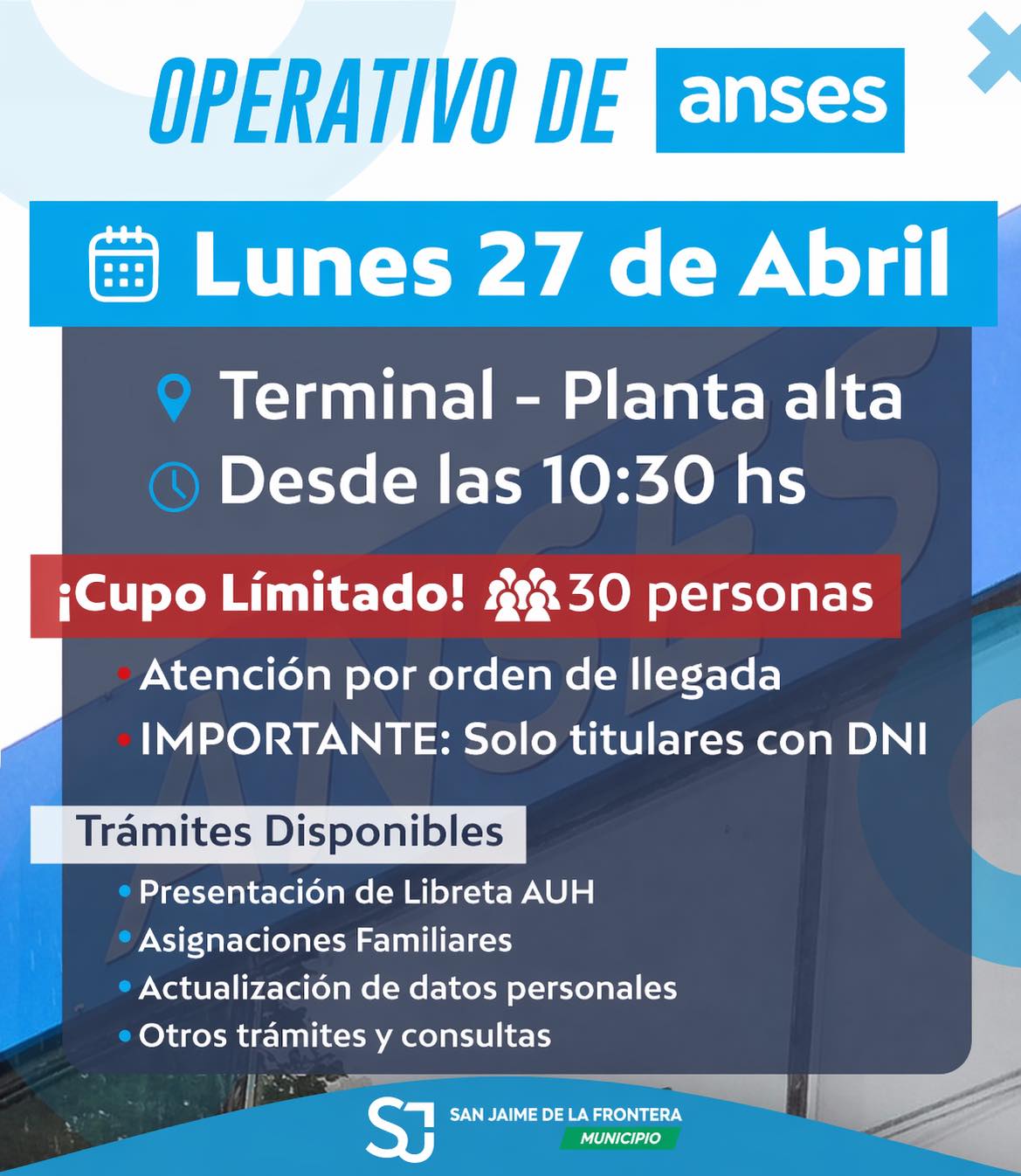23 abril, 2026 - En Destacadas‚ Gestión‚ Noticias Por Prensa Municipal Comentarios Apagados OPERTIVO ANSES Prensa Municipal prensa@sanjaime.gob.ar Previo ENCUENTRO LOCAL DE NIÑEZ Y ADOLESCENCIA