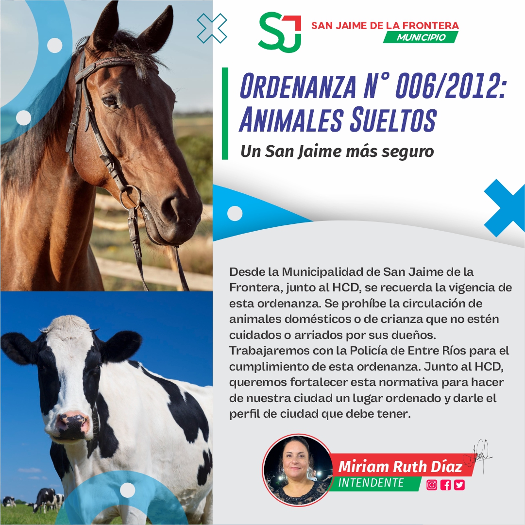 Desde la Municipalidad de San Jaime de la Frontera, junto al HCD, se recuerda la vigencia de esta ordenanza. Se prohíbe la circulación de animales domésticos o de crianza que no estén cuidados o arriados por sus dueños. Trabajaremos con la Policía de Entre Ríos para el cumplimiento de esta ordenanza. Junto al HCD, queremos fortalecer esta normativa para hacer de nuestra ciudad un lugar ordenado y darle el perfil de ciudad que debe tener.