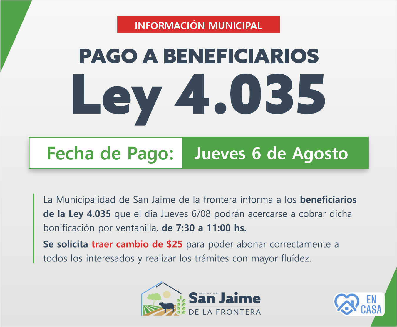 5 agosto, 2020 - En Noticias Por Prensa Municipal Comentarios Apagados PAGO A BENEFICIARIOS DE LEY 4.035 Prensa Municipal prensa@sanjaime.gob.ar Previo OBRAS Y SERVICIOS PÚBLICOS Siguiente OBRAS Y SERVICIOS PÚBLICOS