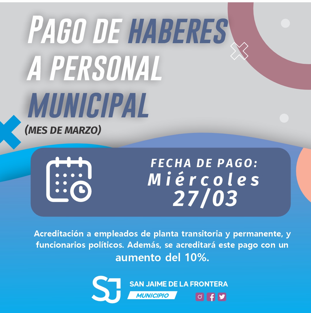 28 marzo, 2024 - En Destacadas‚ Gestión Por Prensa Municipal Comentarios Apagados PAGO DE HABERES Prensa Municipal prensa@sanjaime.gob.ar Previo Inscripciones Abiertas Siguiente Entrega de nueva indumentaria y calzado
