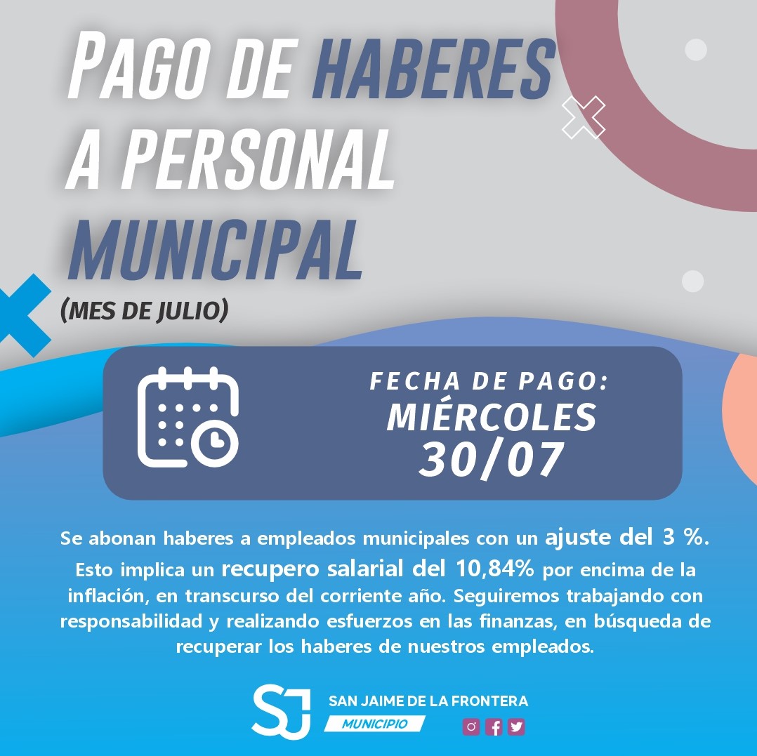 29 julio, 2025 - En Destacadas‚ Gestión‚ Gobierno‚ Noticias Por Prensa Municipal Comentarios Apagados PAGO DE HABERES MUNICIPALES Prensa Municipal prensa@sanjaime.gob.ar Previo UN MINUTO DE INFORMACIÓN Siguiente BOLETAS DIGITALES DE ATER