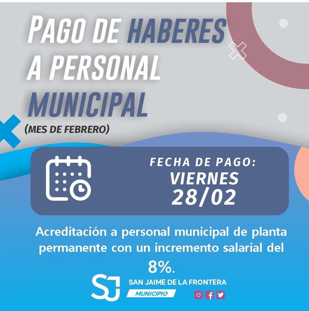 27 febrero, 2025 - En Destacadas‚ Gestión‚ Gobierno Por Prensa Municipal Comentarios Apagados PAGO DE HABERES MUNICIPALES Prensa Municipal prensa@sanjaime.gob.ar Previo FINALIZACIÓN COLONIA DE VACACIONES Siguiente RECOLECCIÓN DE RESIDUOS FERIADO CARNAVAL