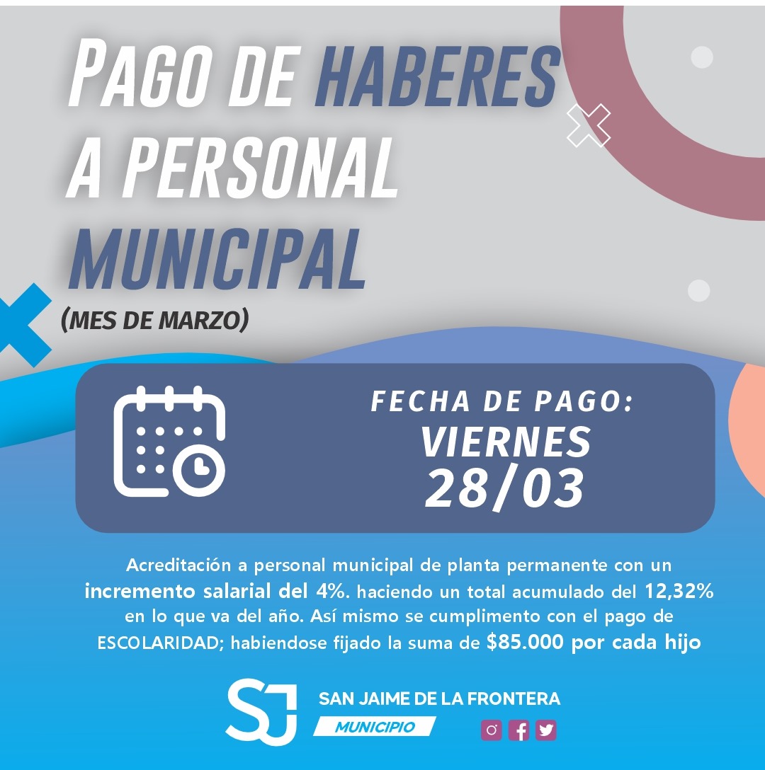 28 marzo, 2025 - En Destacadas‚ Gestión‚ Gobierno Por Prensa Municipal Comentarios Apagados PAGO DE HABERES – PERSONAL MUNICIPAL Prensa Municipal prensa@sanjaime.gob.ar Previo CROSS AVENTURA – SAN JAIME 2025 Siguiente SEMANA DE E.S.I.