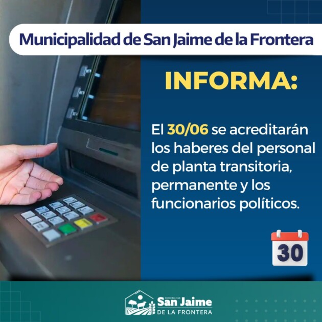 29 junio, 2023 - En Gestión‚ Gobierno‚ Transparencia Por Prensa Municipal Comentarios Apagados Pago de Haberes Prensa Municipal prensa@sanjaime.gob.ar Previo Convocatoria por trámites de Anses Siguiente Mejoramiento en las diferentes calles de la localidad.