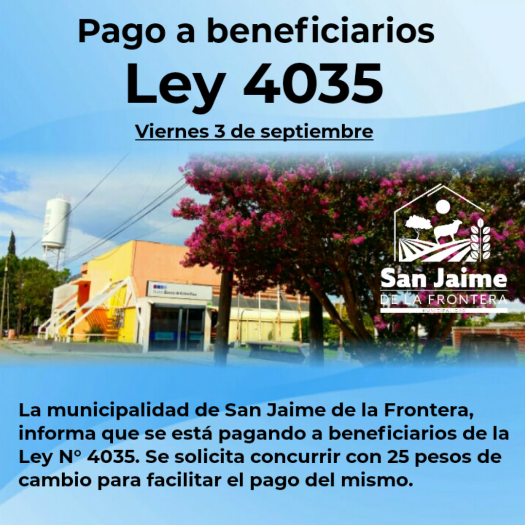 3 septiembre, 2021 - En Noticias Por Prensa Municipal Comentarios Apagados PAGO LEY 4035 Prensa Municipal prensa@sanjaime.gob.ar Previo 5 DE SEPTIEMBRE FERIA DE PRODUCTORES Y ARTESANOS Siguiente LA ESCUELA MUNICIPAL DE FÚTBOL RUMBO A SAN JOSÉ DE FELICIANO