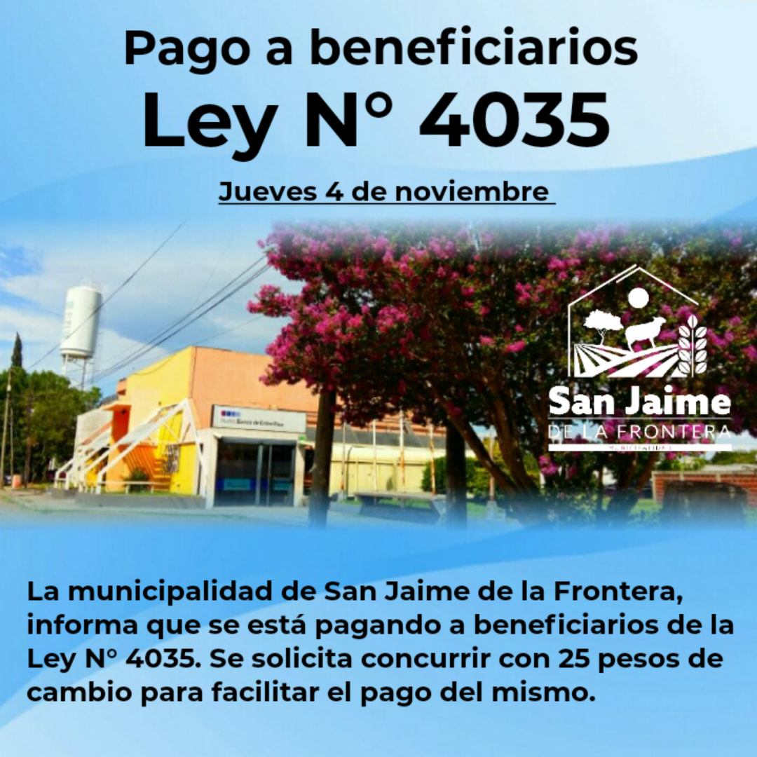 4 noviembre, 2021 - En Noticias Por Prensa Municipal Comentarios Apagados PAGO LEY 4035 Prensa Municipal prensa@sanjaime.gob.ar Previo CAPACITACIÓN DE CUIDADORES DOMICILIARIOS – UADER Siguiente ASUETO ADMISTRATIVO