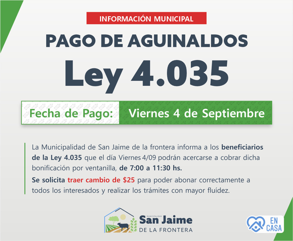 3 septiembre, 2020 - En Noticias Por Prensa Municipal Comentarios Apagados PAGO LEY 4035 Prensa Municipal prensa@sanjaime.gob.ar Previo JUEGOS CULTURALES EVITA 2020 Siguiente FERIA DE ARTESANOS Y PRODUCTORES AUTOCONVOCADOS EN ACCIÓN