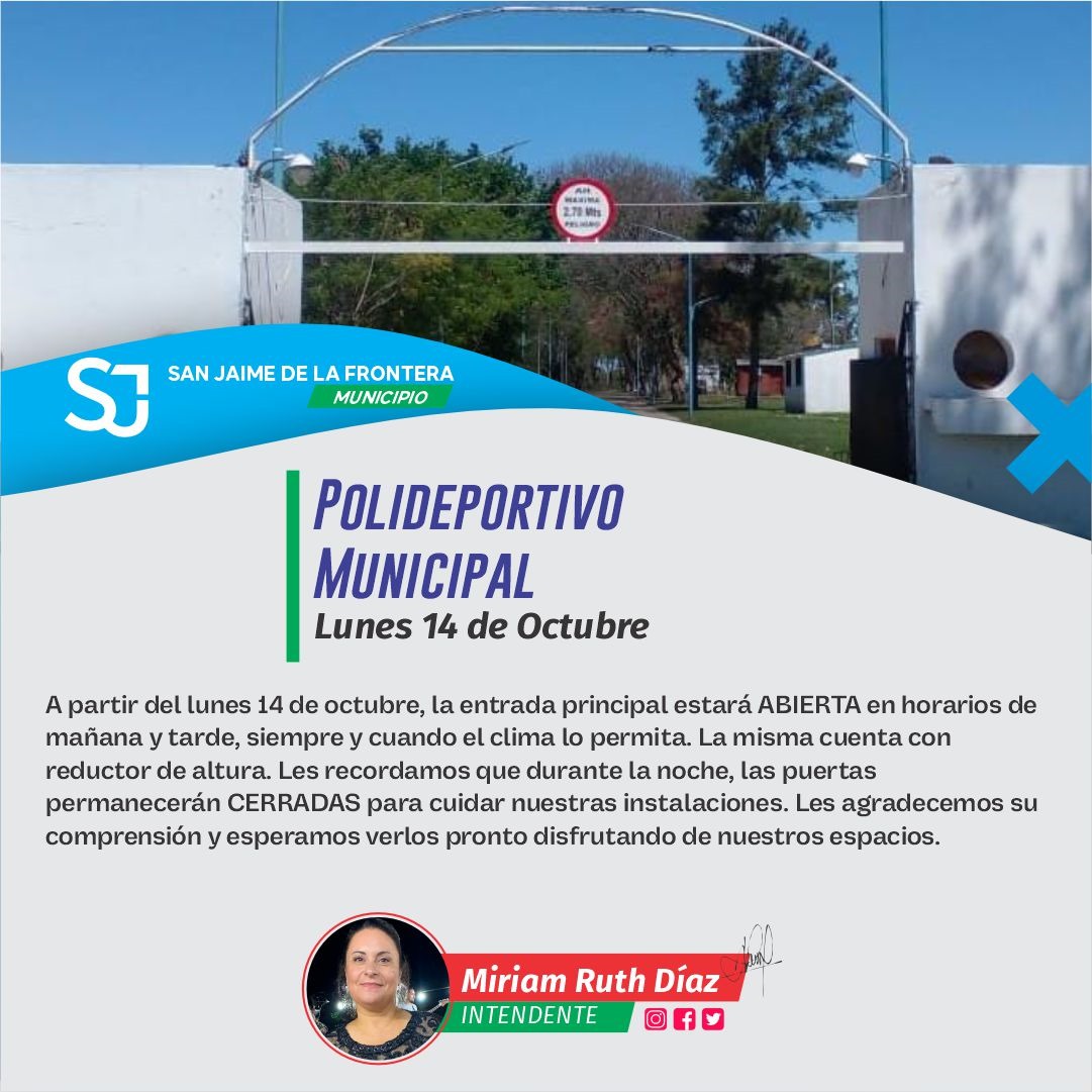 15 octubre, 2024 - En Deportes‚ Destacadas‚ Noticias Por Prensa Municipal Comentarios Apagados POLIDEPORTIVO MUNICIPAL Prensa Municipal prensa@sanjaime.gob.ar Previo PROGRAMA MISIÓN DENGUE Siguiente OPERATIVO ANSES, CAMBIO HORARIO