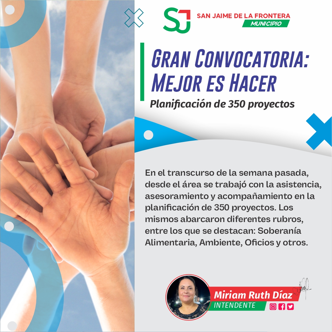Gran convocatoria del programa “MEJOR ES HACER”. En el transcurso de la semana pasada, desde el área se trabajó con la asistencia, asesoramiento y acompañamiento en la planificación de 350 proyectos. Los mismos abarcaron diferentes rubros, entre los que se destacan: