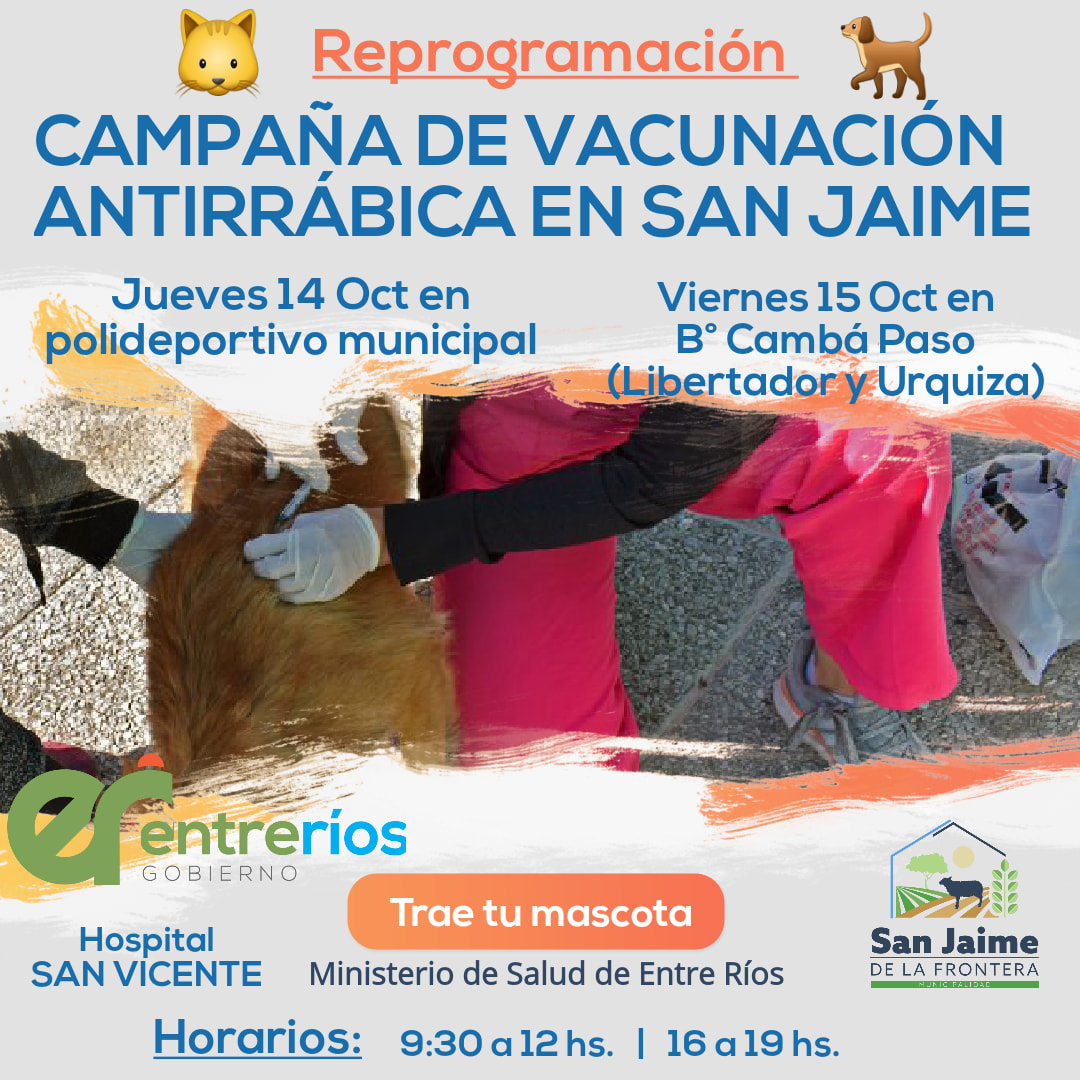 Por razones climáticas, se reprogramó la campaña de vacunación antirrábica en San Jaime. En un trabajo mancomunado entre el Ministerio de Salud de Entre Ríos y el Hospital San Vicente, bajo la coordinación de la directora del nosocomio local, Dra Mabel Garcilazo, se estará llevando a cabo dicha campaña, el día jueves 14 en el polideportivo municipal y el día viernes 15 de octubre en el barrio Cambá Paso (Libertador y Urquiza), ambos días en los horarios de 9:30 a 12 hs, y de 16 a 19 hs. Se recomienda llevar sus mascotas con collar y en el caso de los gatos llevarlos en cajas o mochilas para evitar inconvenientes con otros animales.