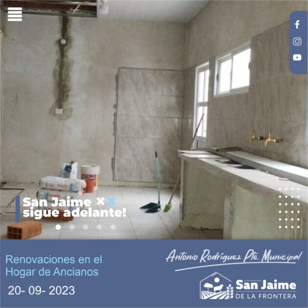 Se está realizando la reconstrucción de la nueva cocina en dicha residencia. Personal municipal se encuentra realizando tareas de mantenimiento en la cocina, se realizó la colocación de un nuevo cielo Raso de PVC, la construcción del nuevo piso con colocación de cerámicas, nueva instalación eléctrica como así también una mesada y el recambio de canillas en la misma.