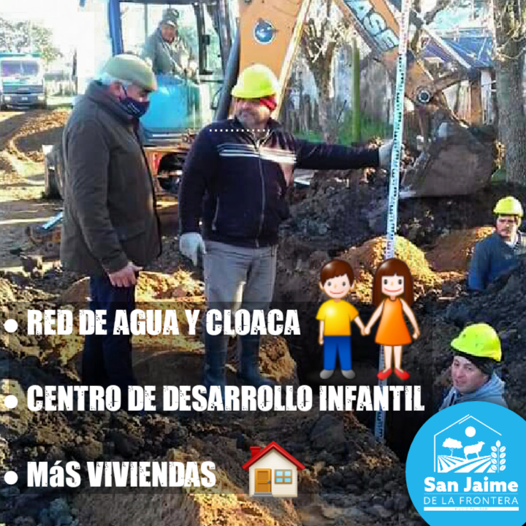 Durante los primeros días del corriente mes de Julio, en la localidad de San Jaime de la Frontera, se pusieron en marcha las obras de saneamiento que contemplan 2.400 metros lineales nuevos de red de agua y 2400 de cloacas, y beneficiarán a familias de los barrios San Cayetano y Pompeya. La misma cuenta con un presupuesto que supera los 41 millones de pesos. Asimismo, el presidente municipal Antonio Rodríguez avanza en gestiones por un Centro de Desarrollo Infantil y nuevas viviendas.