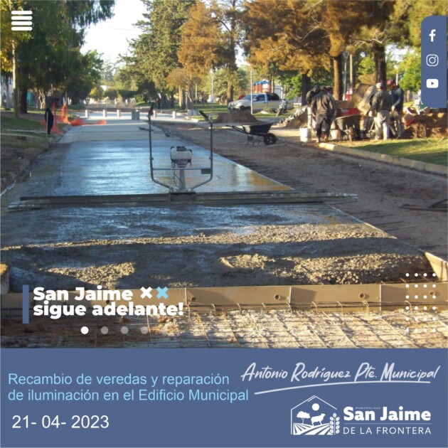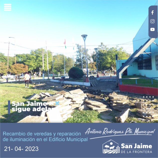 MAS OBRAS: Personal municipal se encuentra trabajando en el recambio de veredas en las instalaciones del edificio municipal. También se está realizando trabajos de reparación de iluminación en dicho lugar.