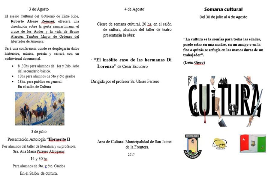 25 julio, 2017 - En Noticias Por Prensa Municipal 0 Programa comienzo de la semana cultural en nuestra ciudad. Prensa Municipal prensa@sanjaime.gob.ar Previo Exitoso “CROSS AVENTURA x 6” Siguiente Elementos para escuelita deportiva