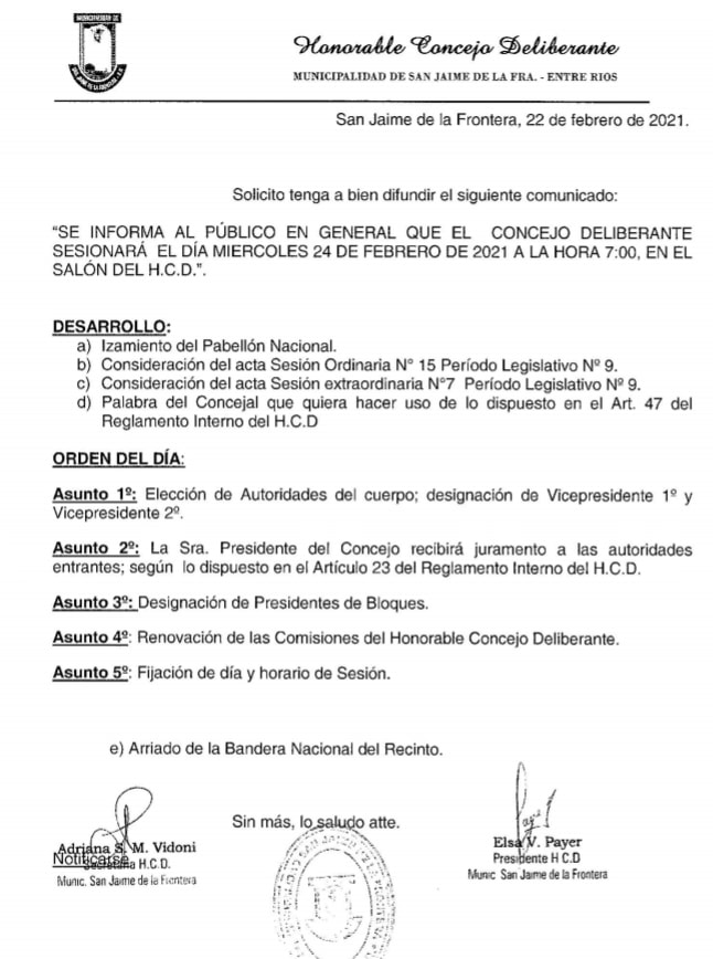 23 febrero, 2021 - En Noticias Por Prensa Municipal Comentarios Apagados SESIÓN DEL HONORABLE CONCEJO DELIBERANTE Prensa Municipal prensa@sanjaime.gob.ar Previo MISIÓN CALEB “DEJA TU HUELLA Siguiente REUNIÓN CON DIRECTIVOS DE LA DIRECCIÓN DE INSPECCIÓN DE PERSONAS JURÍDICAS DE ENTRE RÍOS