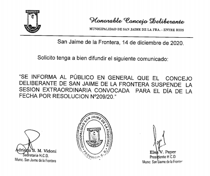 11 diciembre, 2020 - En Gestión‚ Honorable Concejo Deliberante‚ Noticias Por Prensa Municipal Comentarios Apagados SE SUSPENDE SESIÓN HCD Prensa Municipal prensa@sanjaime.gob.ar Previo ANSES ATENDERÁ EN SAN JAIME Siguiente PROYECTANDO OBRAS PARA LA LOCALIDAD