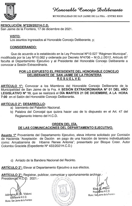 20 diciembre, 2021 - En Noticias Por Prensa Municipal Comentarios Apagados SESION EXTRAORDINARIA H.C.D. Prensa Municipal prensa@sanjaime.gob.ar Previo 24, 30 Y 31 DE DICIEMBRE, DIAS NO LABORABLE Siguiente PAGO AGUINALDO LEY 4035