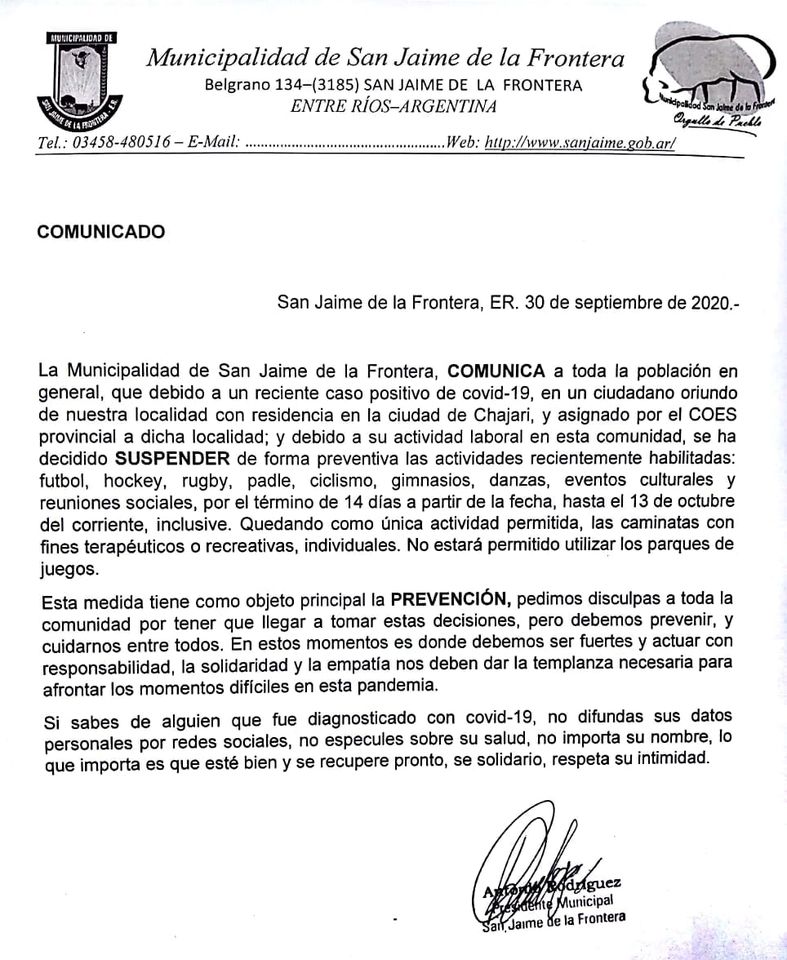 30 septiembre, 2020 - En Noticias Por Prensa Municipal Comentarios Apagados SUSPENSIÓN PREVENTIVA DE ACTIVIDADES – COVID-19 Prensa Municipal prensa@sanjaime.gob.ar Previo INSCRIPCIONES TALLERES CULTURALES Siguiente NUEVA ENTRADA AL BASURAL MUNICIPA