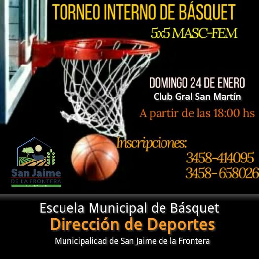 La Dirección de Deportes Municipal organiza para éste domingo 24 de enero de 2021, un torneo interno de básquet en el Club Gral San Martín, con alumnos de la escuela municipal y deportistas locales.